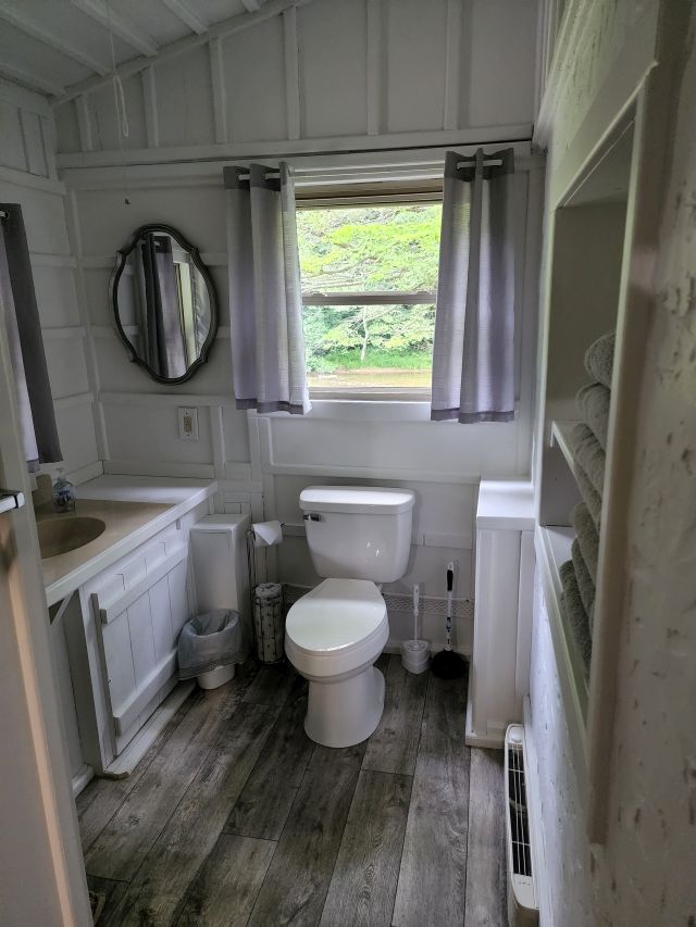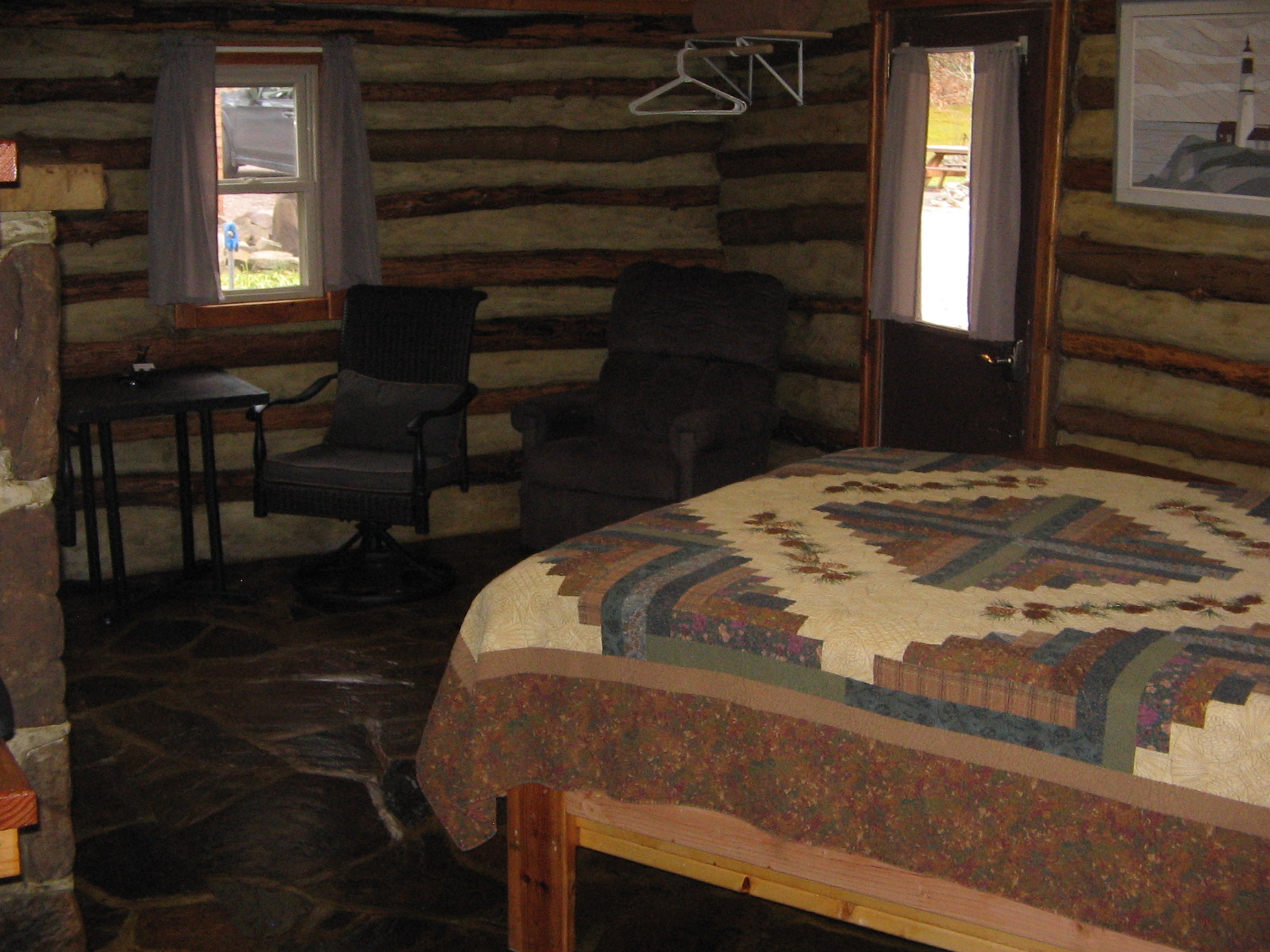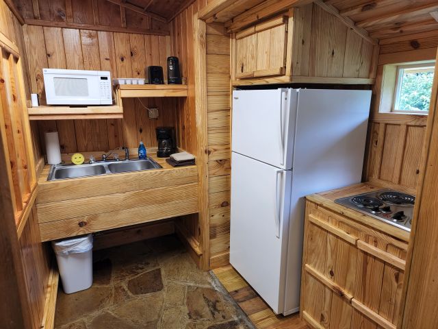 The Beaver has a Queen bed, a cook top range, microwave, fridge, coffee pot, full bath, streaming TV, electric heat and A/C. It has a charcoal grill and fire pit. Great view of the River.